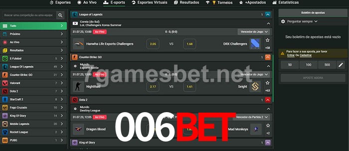 O 006Bet oferece uma grande seleção de opções de apostas em e-sports com probabilidades competitivas